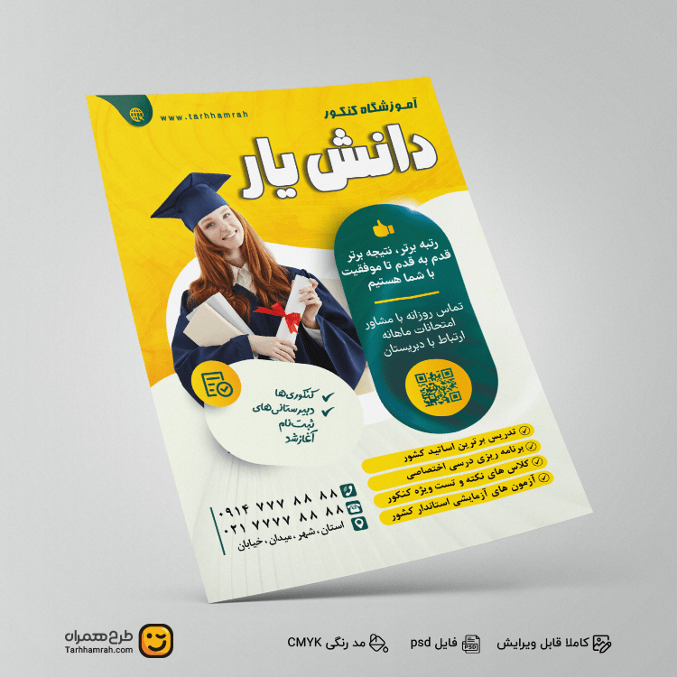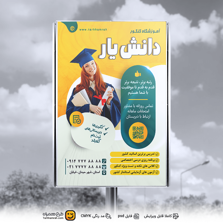 این طرح لایهباز با دقت طراحی شده تا هم زیبا و هم کاربردی باشد. از شلوغی غیرضروری پرهیز شده و هر عنصر با هدف مشخصی قرار گرفته است. فونتها با دقت انتخاب شدهاند تا خوانایی و جذابیت را تضمین کنند. این طرح با استانداردهای جهانی تبلیغات همخوانی دارد و برای انواع آموزشگاههای کنکور، از محلی تا کشوری، ایدهآل است.