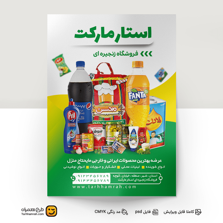 این فایل آماده، با سایز استاندارد A4 و رنگبندی چشمنواز سفید، زرد و سبز، گزینهای عالی برای تبلیغات سوپر مارکتها، فروشگاههای مواد غذایی و حتی بنرهای فضای مجازی است. طراحی آن با رعایت آخرین استانداردهای تبلیغاتی انجام شده تا مطمئن باشید که طرح شما نه تنها زیبا، بلکه از نظر روانشناسی رنگها و جذب نگاه مشتری نیز بینقص عمل میکند.