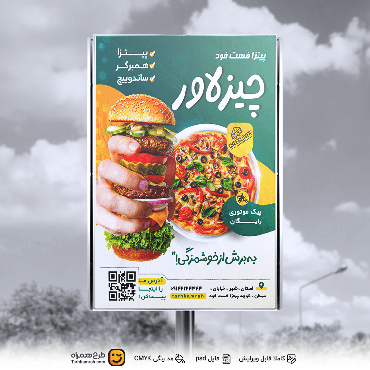 این طرح لایه باز با دقت طراحی شده تا هم زیبا و هم کاربردی باشد. از شلوغی غیرضروری پرهیز شده و هر عنصر با هدف مشخصی قرار گرفته است. فونتها با دقت انتخاب شدهاند تا خوانایی و جذابیت را تضمین کنند. این طرح با استانداردهای جهانی تبلیغات همخوانی دارد و برای انواع فست فودها، از محلی تا زنجیرهای، ایدهآل است.
